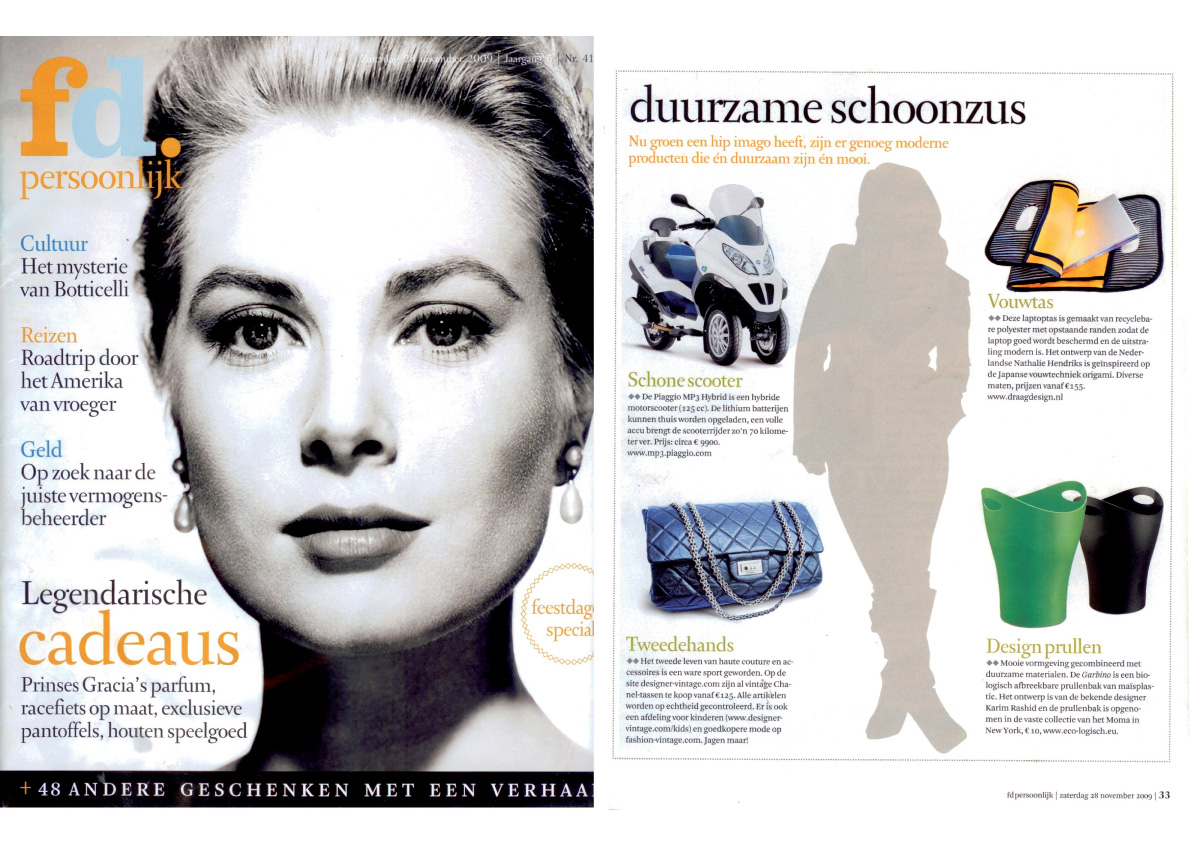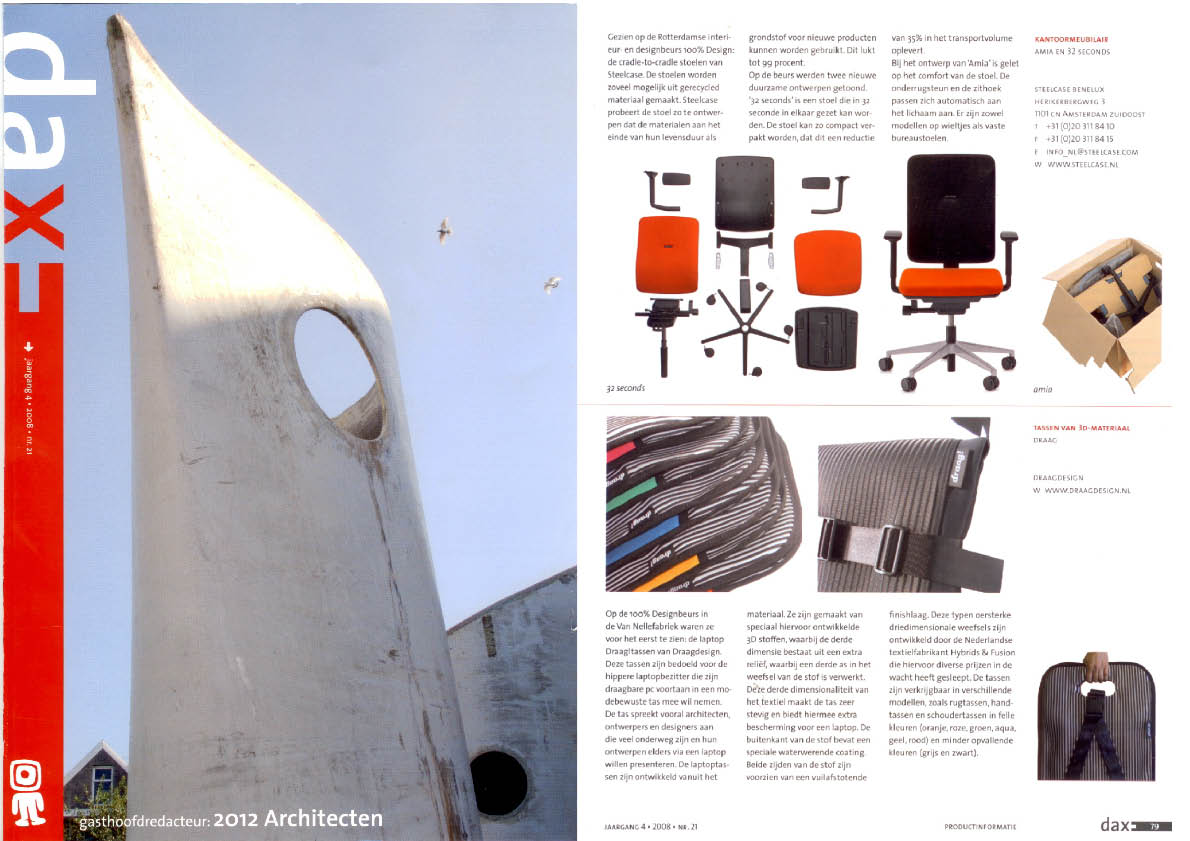 Deze laptoptas is gemaakt van recyclebare polyester met opstaande randen zodat de laptoptas goed wordt beschermd en de uitstraling modern is. Het ontwerp van de Nederlandse Nathalie Hendriks is geïnspireerd op de Japanse vouwtechniek origami. Diverse maten, prijzen vanaf €155,-. www.draagdesign.nl