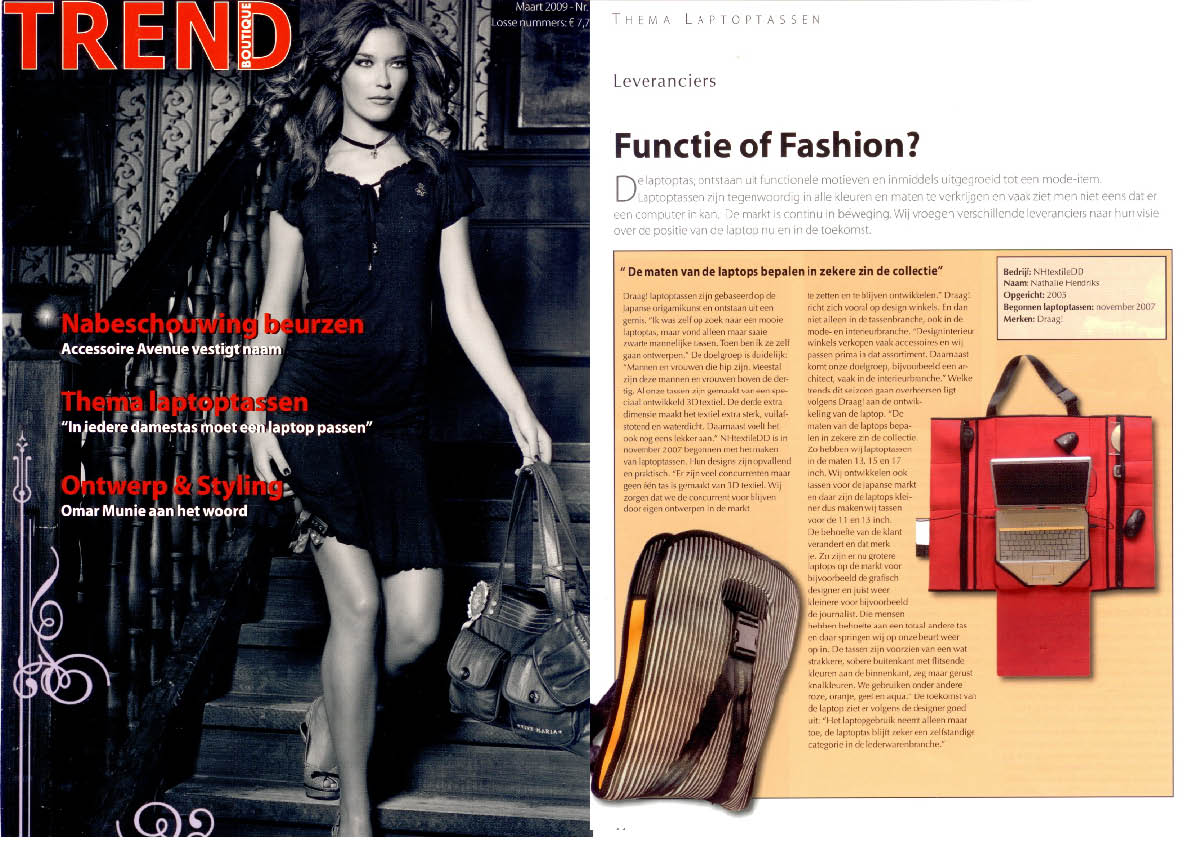 Functie of Fashion. De laptoptas; ontstaan uit functionele motieven en inmiddels uitgegroeid tot een mode-item. Laptoptassen zijn tegenwoordig in alle kleuren en maten te verkrijgen. De tassen van DRAAG! zijn voorzien van een wat strakkere, sobere buitenkant met flitsende kleuren aan de binnenkant, zeg maar gerust knalkleuren.